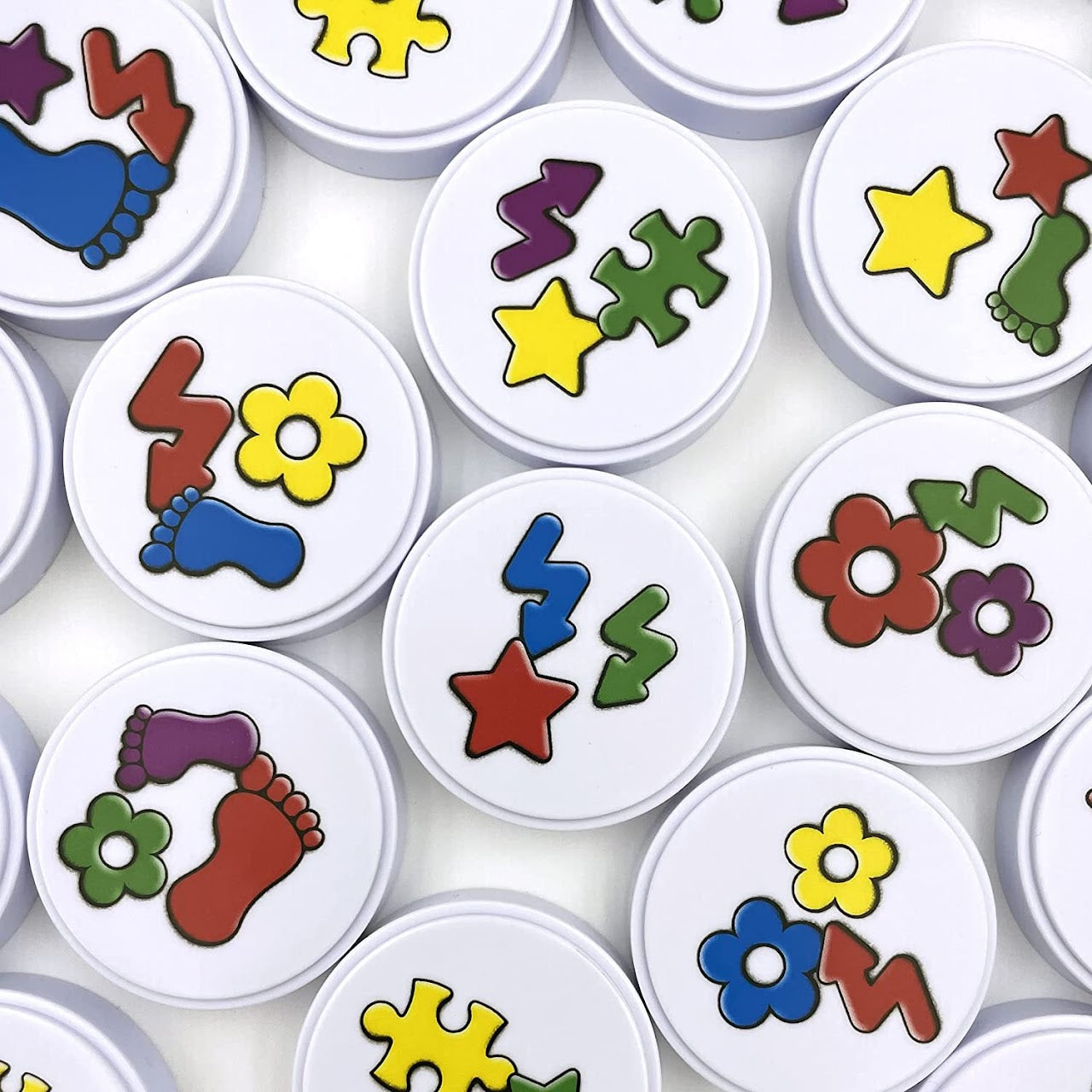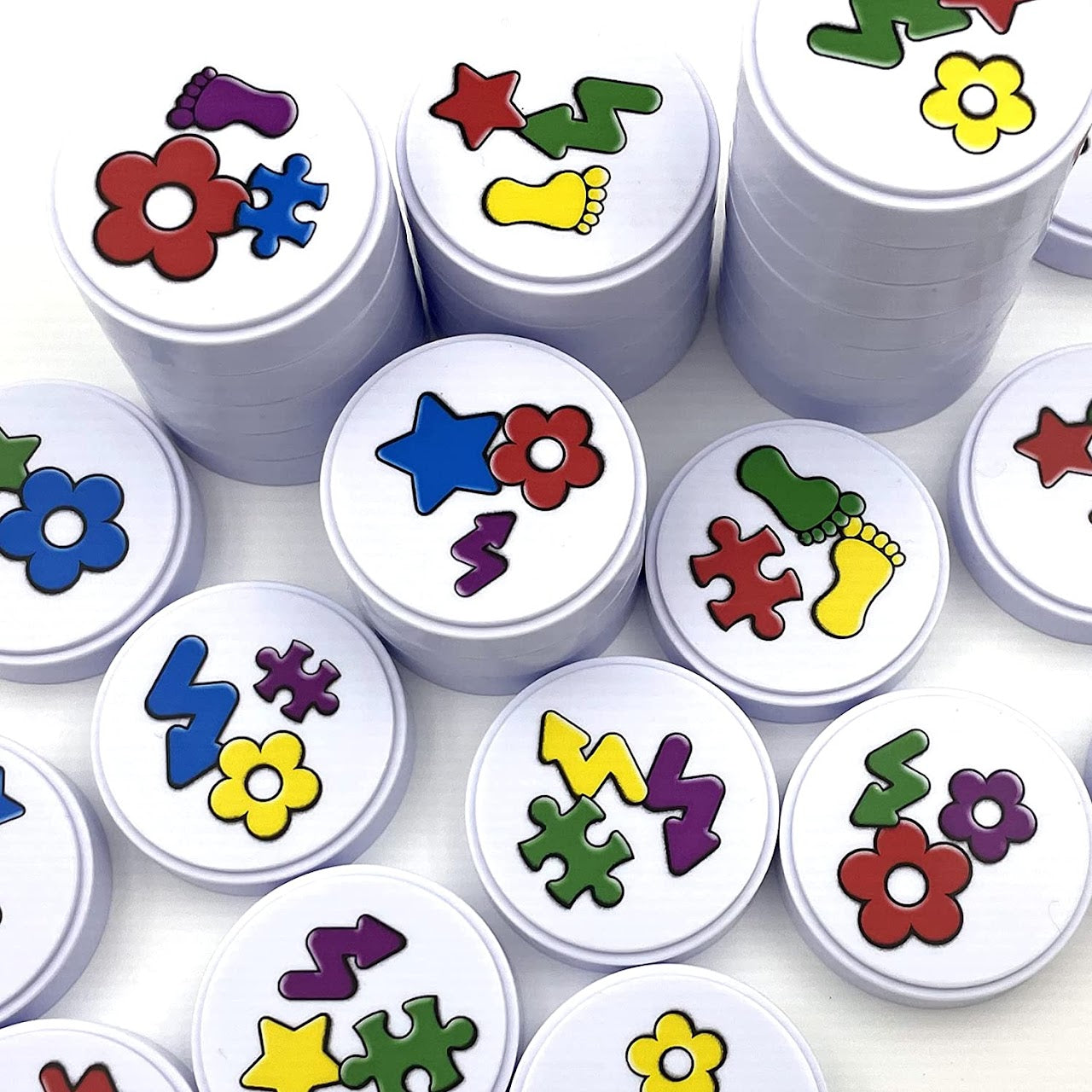 To set up the game, lay out all 36 discs face up so that everyone can see the colored symbols on them. One player rolls the two dice – one showing colors, the other symbols – then everyone simultaneously tries to grab any discs showing the colored symbol determined by the die roll. If a die shows a white face instead of a color or symbol, then that characteristic is ignored for the round. For example, if the roll is white (i.e., blank) and red, then players can grab any disc with a red symbol. If both dice show white, then it's a free-for-all, with players grabbing as many discs as possible!