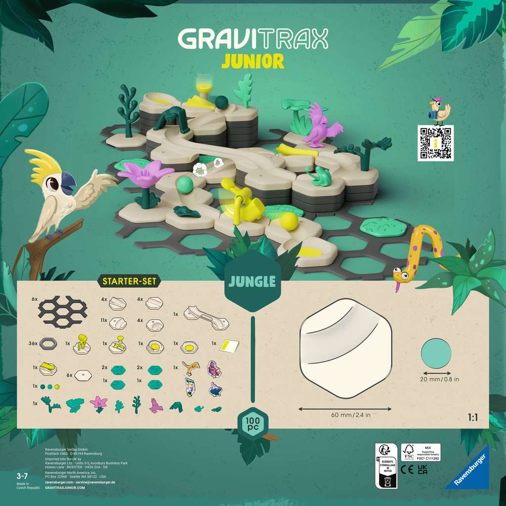 It’s a jungle out there, so help your child or grandchild gain essential skills while having a blast with “GraviTrax Junior Starter set – Jungle”! Watch your child discover their inner engineer! Now young kids can enjoy the thrill of watching their ball roll through a fun jungle marble maze they made themselves! “GraviTrax Junior — Jungle” is an interactive track system for children ages 3 to 7, with pieces sized for little hands. Easy to assemble with tons of possible track layouts for hours of repeat play! Themed expansion sets add to their marble run fun, and it’s sustainably made! Makes a great birthday or holiday gift! With GraviTrax Junior, building and playing fun is always on track! This creative, expandable system is especially designed for younger children, challenging them to use their imagination to build their own marble runs! STEM-friendly concepts build critical thinking and problem-solving skills. Completely open-ended, this Jungle Starter-Set contains everything needed to build a variety of tracks.