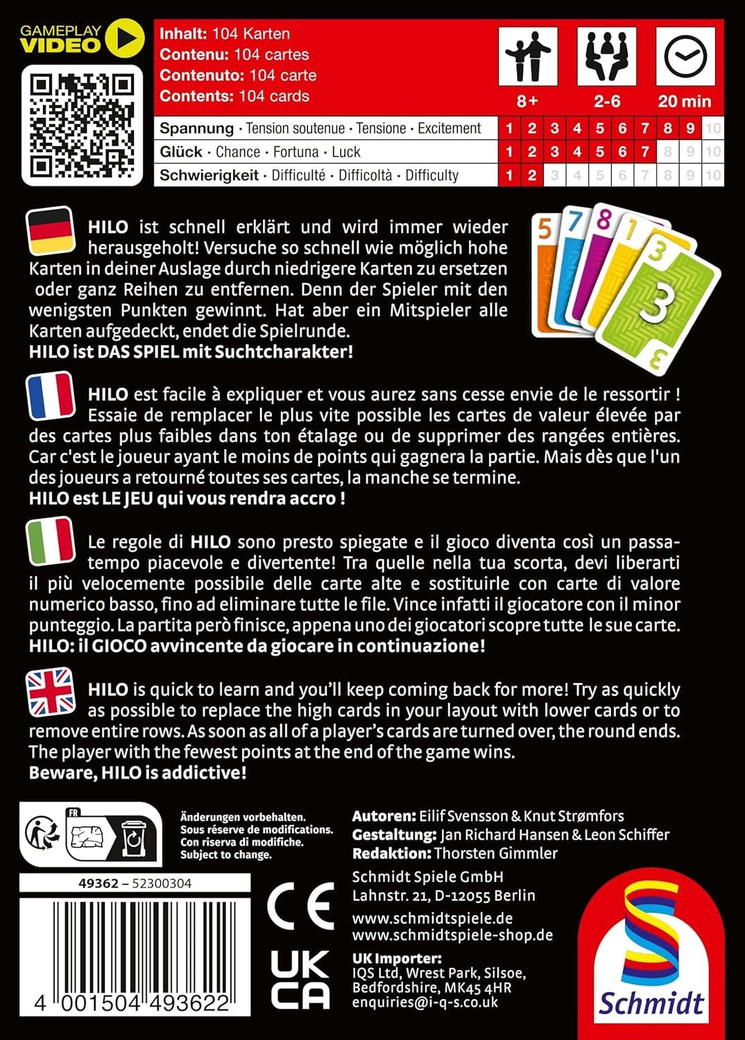 In Hilo, try to exchange high cards for the lowest possible ones from the draw pile. In the end, the player with the fewest points wins. If you manage to place three cards of the same colour in a row, remove them from your display and save a lot of points. A fast-paced card game that's really addictive.