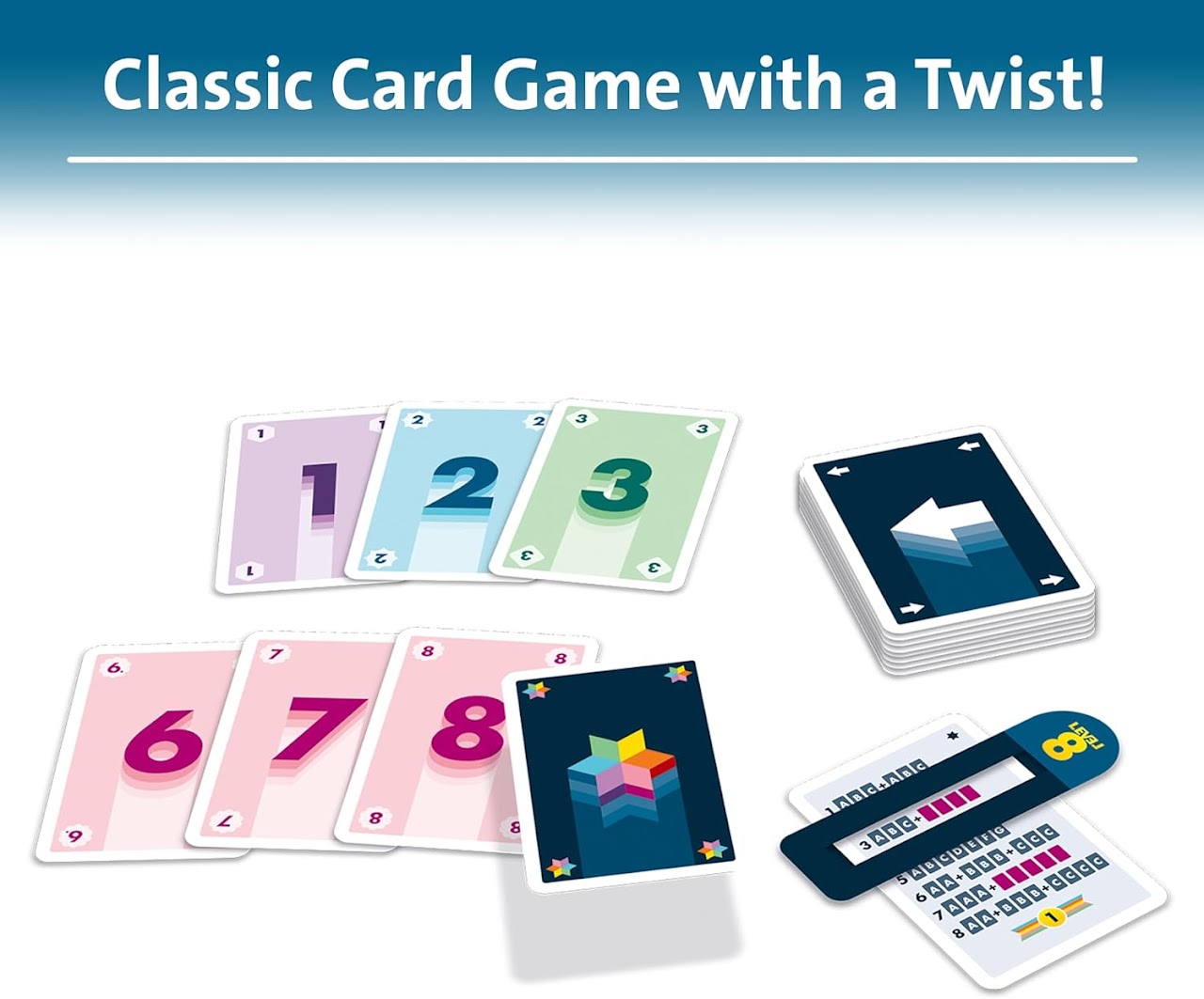 Be the first to collect the crazy combinations of colors and numbers needed to reach Level 8. A simple, quick game perfect for families and card game lovers of all ages! Race to collect pairs, triples, and runs of increasing difficulty as you level up. Complete Level 8 first to win! Classic card game with a Twist - Perfect for card game lovers who enjoy tried and true classics like Rummy!