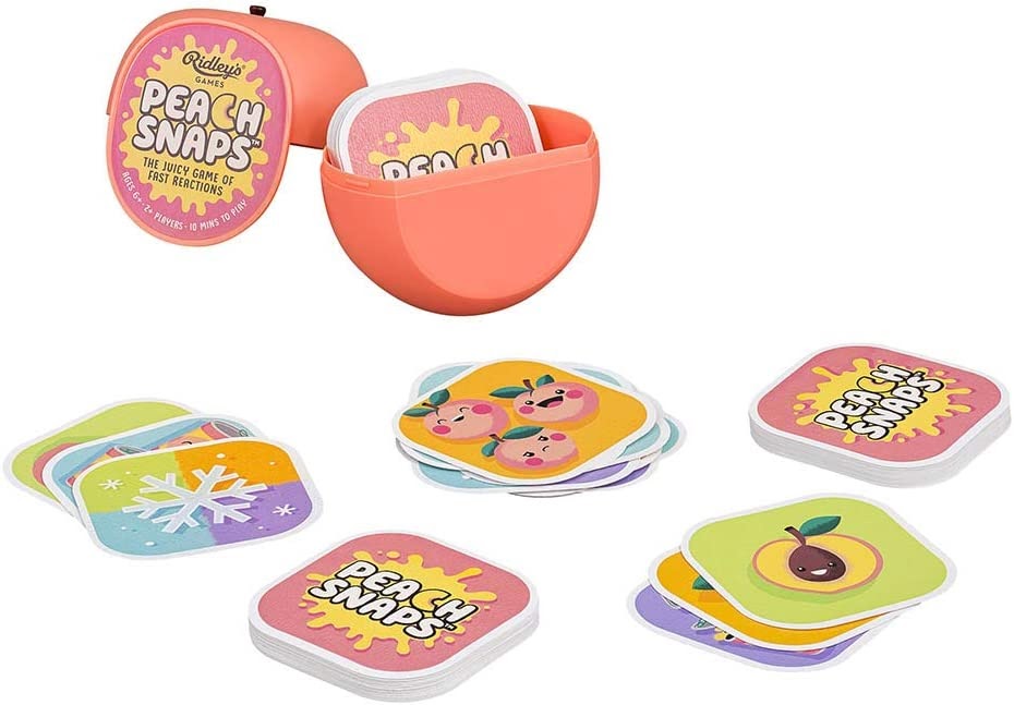 Peach Snaps is a fun game of fast reactions. Set up the game by dealing out the entire pack of cards equally between the number of players and leaving one card in the middle to start the snap pile. Each player must then draw the top 3 cards from their respective draw piles to create their hand (make sure the other players don't see your hand). Snap down any card from your hand onto the centre piles each time there’s a match by colour , symbol or number. Only when you have used all three cards in your hand are you able to draw a new hand. Everyone plays at once in a furiously fast race to get rid of their cards fast. To make things even more fun, there are action cards throughout the pack – a freeze card, a new peachy pile card and a clear hand pile. Any card can be played on top of an action card. When you play the freeze card, you are then able to nominate any player who can't play until 5 cards have been played in the game. The new peachy pile card allows you to start another brand new pile in addition the the main snap pile. If the clear hand card is among the three cards in your hand you are able to discard your entire hand onto the snap pile with the clear hand card on top. The first player with no cards left wins by saying ‘Peach Snaps!’
