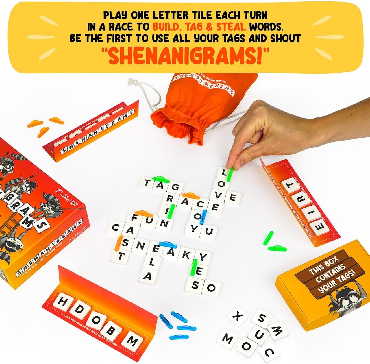 - SUPER COMPETITIVE, HIGHLY ADDICTIVE. Battle head-to-head in a nail-biting race to build, tag and steal words from your opponents using stealth, strategy and wordy wickedness. Be the first to use all your tags and shout "SHENANIGRAMS!".
